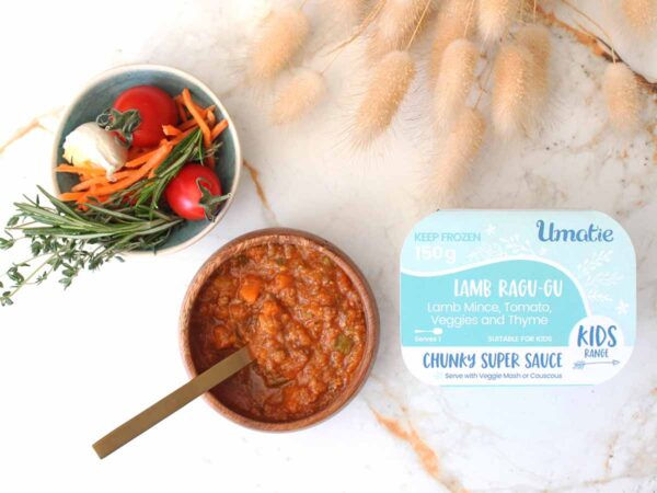 Veggies (Tomato, Carrot, Baby Marrow, Tomato Puree Mix (Tomato Paste, Water)) (72%), Lamb Mince (17%), Chicken Broth (Water, Free Range Chicken), Date, Celery, Onion Mix (Onion, Garlic), Pink Salt, Vegetable Oil (Olive Fruit), Rosemary, Thyme, Dried Origanum.