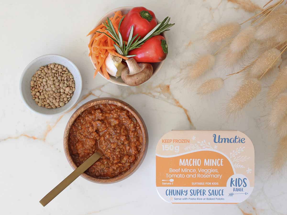Veggies (Tomato Puree Mix (Tomato Paste, Water), Carrot, Mushroom, Red Pepper) (53%), Beef Mince (32%), Brown Lentils, Onion Mix (Onion, Garlic), Brown Sugar, Pink Salt, Vegetable Oil (Olive Fruit), Rosemary.